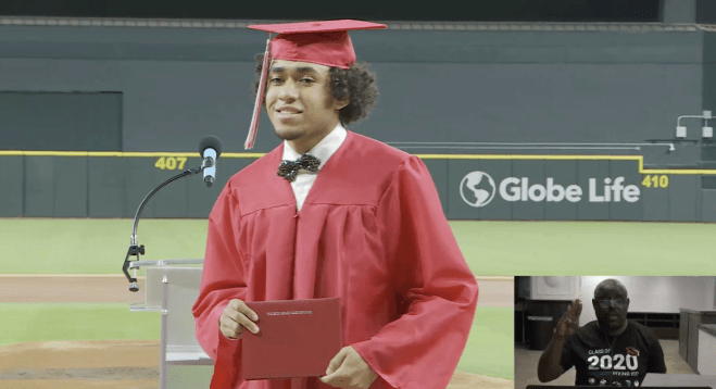 Zeke Brewer accepts his diploma in graduation ceremony at Globe Life Field in Arlington, new home of the Texas Rangers