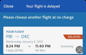 Meanwhile, Sarah was headed to the airport in Florida, but got yet another text alert that said departure time was now 8:03 pm. This one added a tag line: “Possible missed connection to OKC.”