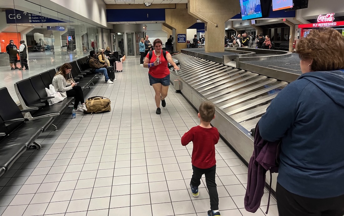 It was another 5 minutes or so before Sarah emerged from the plane and walked to the baggage area where we waited.