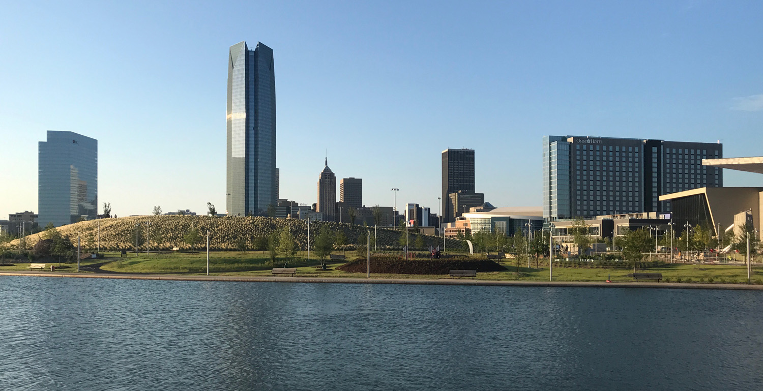 OKC skyline seen from the footbridge across Scissortail Lake