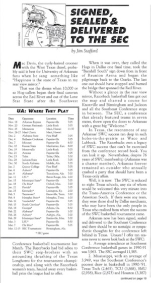 That was the theme when 10,000 or so Hog-callers began their final caravan across the Red River and out of the Lone State after the Southwest Conference basketball tournament last March. The Razorbacks had bid adieu to their SWC step-brothers with an astounding thrashing of the Texas Longhorns for the tournament championship, and along with the Razorback women’s team, hauled away every basketball prize the league had to offer.